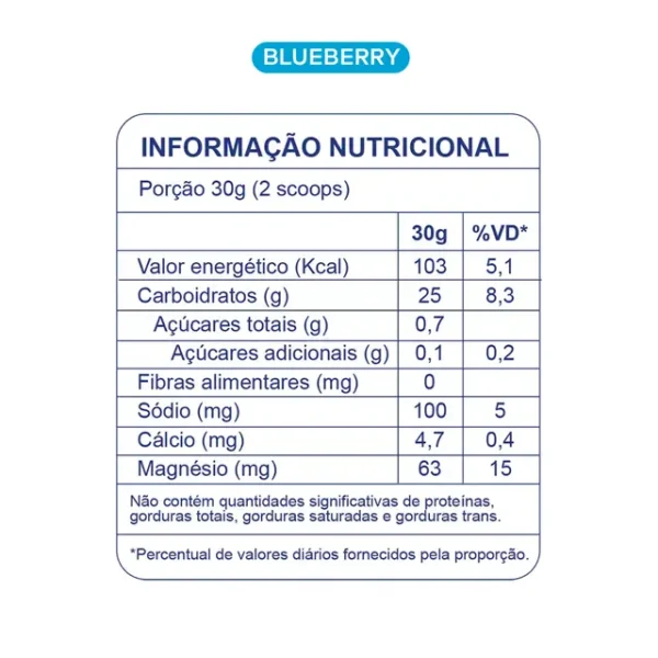 Maltodextrina, beterraba em pó, blueberry em pó, limão em pó, bisglicinato de magnésio, água de coco em pó, estabilizante citrato trissódico, acerola em pó, gengibre em pó, acidulante ácido cítrico, aroma idêntico ao natural de blueberry, edulcorante estévia.