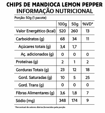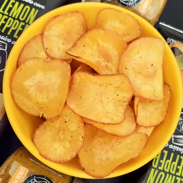 Aqui a versão com o tempero Lemon Pepper da BR Spices: uma combinação perfeita de pimenta do reino e raspas de limão totalmente naturais e sem glutamato, que adiciona um toque excepcional ao chips, conferindo um equilíbrio perfeito entre o picante e o cítrico.