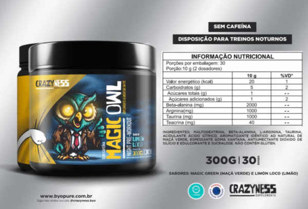 O Magic Owl é um pré-treino sem cafeína, desenvolvido especialmente para quem treina no período noturno, possui sensibilidade a estimulantes ou busca melhorar o desempenho físico sem comprometer a qualidade do sono. Sua fórmula funcional atua diretamente na redução da fadiga, no aumento da resistência e na melhora da intensidade dos treinos, garantindo performance de forma equilibrada e segura.