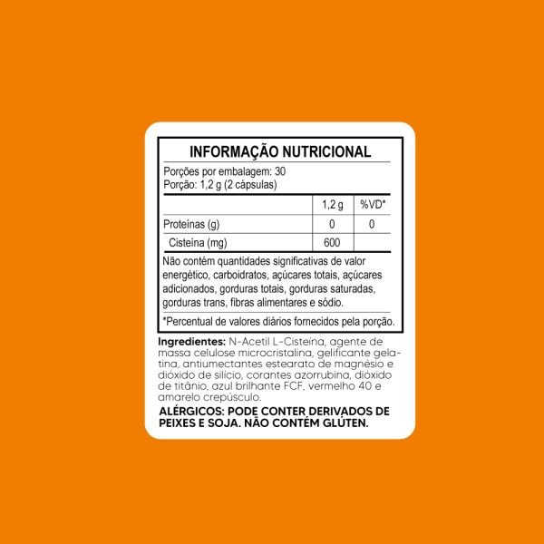 Ingredientes: N-Acetil L-Cisteína, agente de massa celulose microcristalina, gelificante gelatina, antiumectantes estearato de magnésio e dióxido de silício, corantes azorrubina, dióxido de titânio, azul brilhante FCF, vermelho 40 e amarelo crepúsculo.