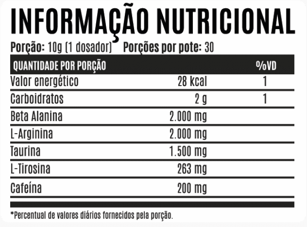 Ideal para quem busca otimizar a rotina de treinos e alcançar seus objetivos com mais intensidade e foco, o pré treino atua como um aliado para seus objetivos, impulsionando seu desempenho. Este pré treino é um aliado para quem busca mais energia e foco. Sua fórmula com Arginina, Creatina, Taurina, L-Alanina e cafeína, promove suporte para seus treinos.
