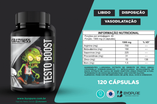 Testo Booster é um suplemento natural que aumenta naturalmente a testosterona e contribui no aumento da massa muscular, disposição, vasodilatação, libido, fertilidade, além de agir contra a impotência e disfunção.