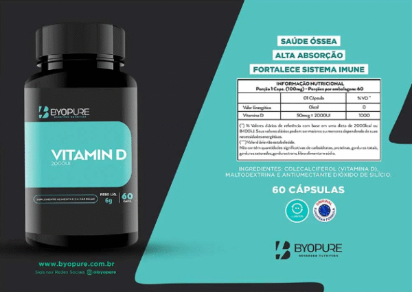 A Vitamina D Byopure é um suplemento que contém 2000 UI por cápsula, essencial para a saúde óssea, muscular e imunológica. Ela ajuda a fortalecer o sistema imunológico, melhora a absorção de cálcio e magnésio, e contribui para a saúde dos ossos e músculos.